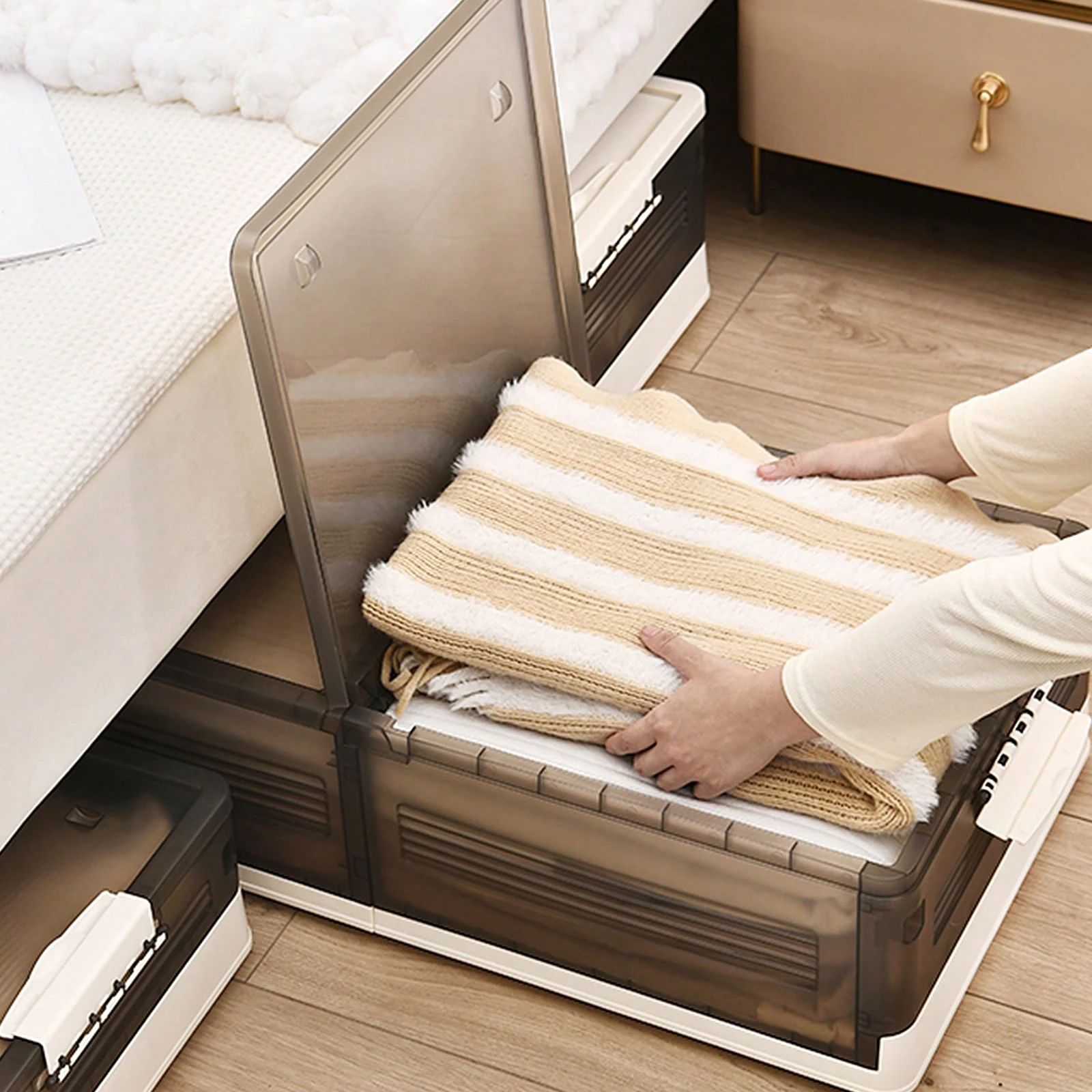 Zapomeňte na tahání těžkých boxů! Díky integrovaným kolečkům stačí jen jemně zatlačit – box hladce vyjede i zpod nízké postele nebo gauče.