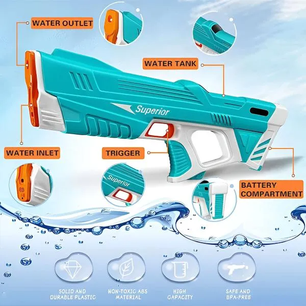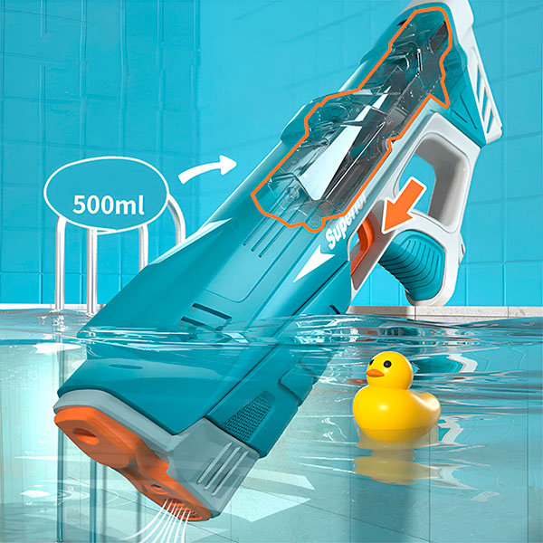 Vodní pistole s elektrickým čerpadlem střílí silný proud vody bez nutnosti ručního pumpování – stačí zmáčknout spoušť a začít bitvu!